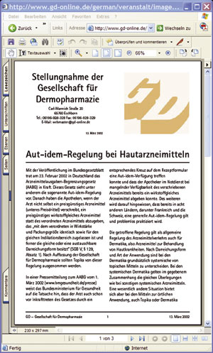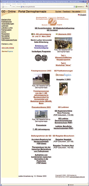 All three linked homepages are meanwhile very frequently accessed. They are almost always listed in first positions by international search machines as Google, Yahoo or Alltheweb. A practical test by means of the terms "dermopharmacy" or "dermopharmazie" will confirm this statement. Via the search machines indicated all sub pages of the homepages are easily and securely retrieved. GD-homepage www.gd-online.de The GD-homepage has increased since its start in 1998 to a large library in which more than 3.000 DIN-A 4 pages in German and partly in English as well as more than 1.400 photographs and illustrations are available. On a monthly average at present more than 3.000 visitors (IP-addresses) and more than 13.000 retrievals for articles are registered. The start page of the homepage conveys a good overview of the various contents which are archived at the sub pages. The columns media information, publications, events, guidelines, literature links, departments, personal and archive are permanently actualised. Under the column media information for example the press texts and press photographs of the GD which have become very numerous in the meantime can be retrieved. The column events comprises the scientific programs of all meetings and symposia of the GD as well as summaries of all lectures held at these events. The column literature links leads to online publications of GD members, the column personal to the board, to a list of the sponsoring members of the GD and the statutes and articles of the GD.