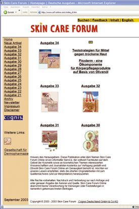 The online-version represents an additional benefit for the readers of the print version in the form of a faster electronic archive which can be used for searches. In addition to the articles published in the printed version, in the online-issues also authors' articles indicated by name as well as original versions of statements and guidelines of the GD with complete literature reference are published. That the additional offers are intensely used by the readers of the print version is reflected by the numerous visits at the homepage shortly after publishing of the magazines. They are printed in a number of copies of more than 4.500 issues and regularly distributed to the members of the GD, subscribers and all dermatologists acting in Germany. Skin Care Forum: www.scf-online.com Skin Care Forum is a worldwide known, in German and English published online-information service by Cognis Deutschland GmbH & Co. KG, a sponsoring member of the GD. Under the domain www.scf.online.com there are approximately 2.000 DIN A-4 pages in German, a corresponding number of pages in English as well as more than 1.000 illustrations regarding cosmetic subjects are retrievable. Experts in the cosmetic field as well as scientists and journalists interested in cosmetic topics are regularly posted by a monthly newsletter service with current information from this special field. Skin Care Forum started in 1999. Meanwhile 15 online-issues have been published which have made of Skin Care Forum a comprehensive bilingual reference. At present approximately 7.500 visitors and 18.000 article retrievals are registered at the homepage on a monthly basis. Due to the convincing acceptance of the online-version the print version has been discontinued at the end of 2000.