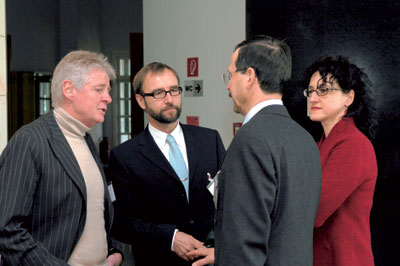 Rezepturexperten im Gespräch: Dr. Holger Reimann (2. von links), Leiter des Pharmazeutischen Laboratoriums des Neuen Rezeptur- Formulariums (NRF) inEschborn, informierte über die Anforderungen, die Ausgangsstoffe dermatologischer Rezepturen erfüllen müssen. Diplombiologin Friederike Schüller (rechts) von der Firma Caesar & Loretz GmbH, Werk Bonn, stellte die Ergebnisse eines Ringversuchs vor, der zeigte, dass die mikrobiologische Qualität von in öffentlichen Apotheken angefertigten Rezepturen in aller Regel akzeptabel ist.