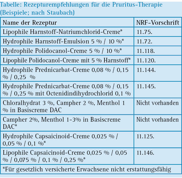 Große Bedeutung in der Pruritus-Therapie hat nach Staubachs Auffassung auch die dermatologische Rezeptur. Als Beispiele nannte sie die Rezepturempfehlungen, die in die in Kürze zu erwartende Neufassung der Pruritus-Leitlinie der Deutschen Dermatologischen Gesellschaft einfließen sollen (siehe Tabelle). Die meisten dieser Rezepturen enthalten jedoch keine verschreibungspflichtigen Arzneistoffe und sind deshalb für gesetzlich versicherte Erwachsene nicht erstattungsfähig.
