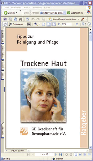 Ebenfalls auf der Startseite zu finden ist eine aktuelle Informationsbroschüre der GD, die in Kurzfassung die Ziele und Aktivitäten der Gesellschaft beschreibt und einen Aufnahmeantrag für ordentliche und fördernde Mitglieder enthält. In letzter Zeit werden Informationen verstärkt in Form von gesetzten Broschüren im PDF-Format angeboten. In dieser attraktiven Form sind die neueren Leitlinien und Stellungnahmen der GD sowie die Verbraucherratgeber „Trockene Haut“ und „Nagelpilz“ aufbereitet worden.